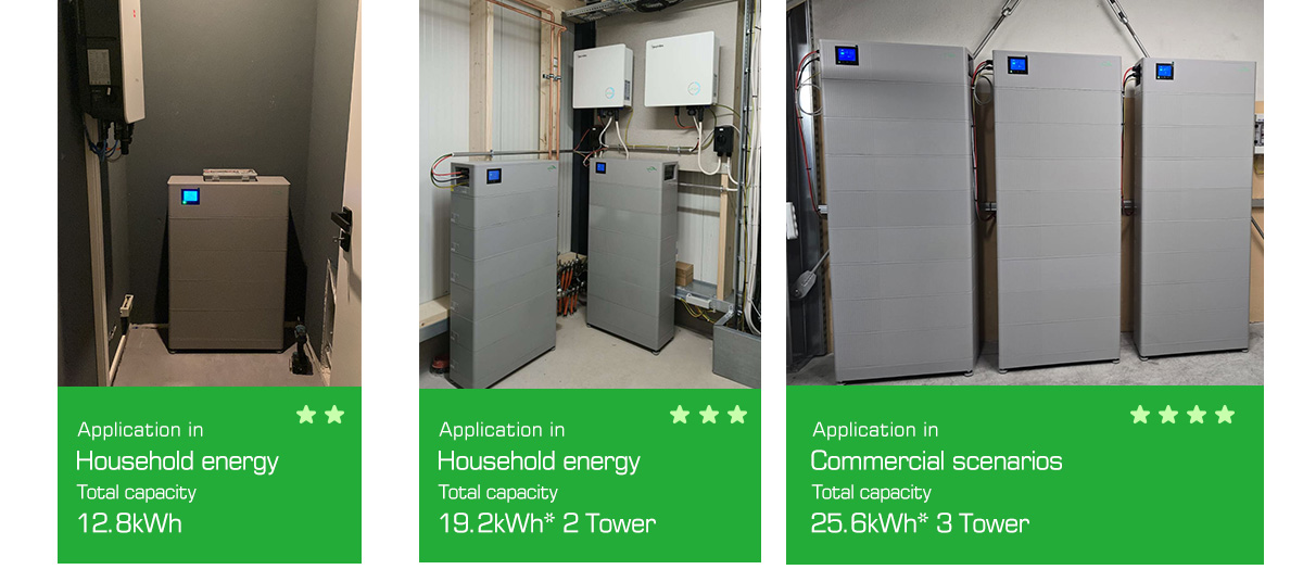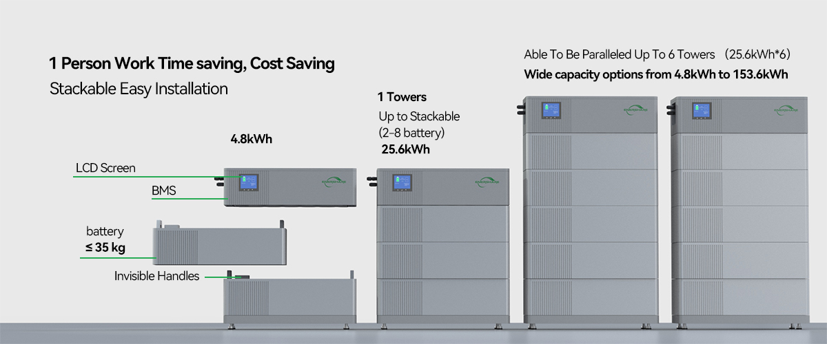Das stapelbares Batteriesystem unterstützt bis zu 6 Türme parallel mit Kapazitäten von 4,8 kWh bis 153,6 kWh. Jeder Akku wiegt ≤36,5 kg, ermöglicht Stapelinstallation durch eine Person mit Leichtigkeit.
